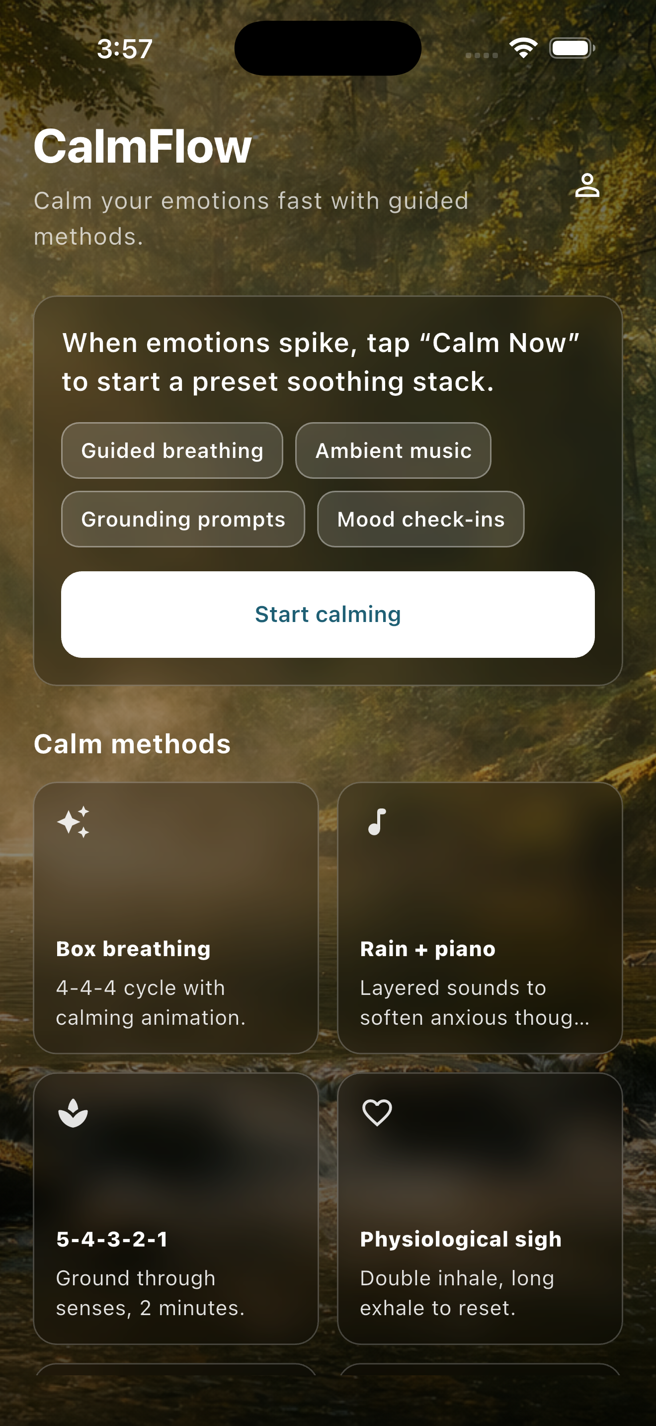 Use CalmFlow when the day feels heavy and you need a gentle reset without opening a crowded wellness dashboard.